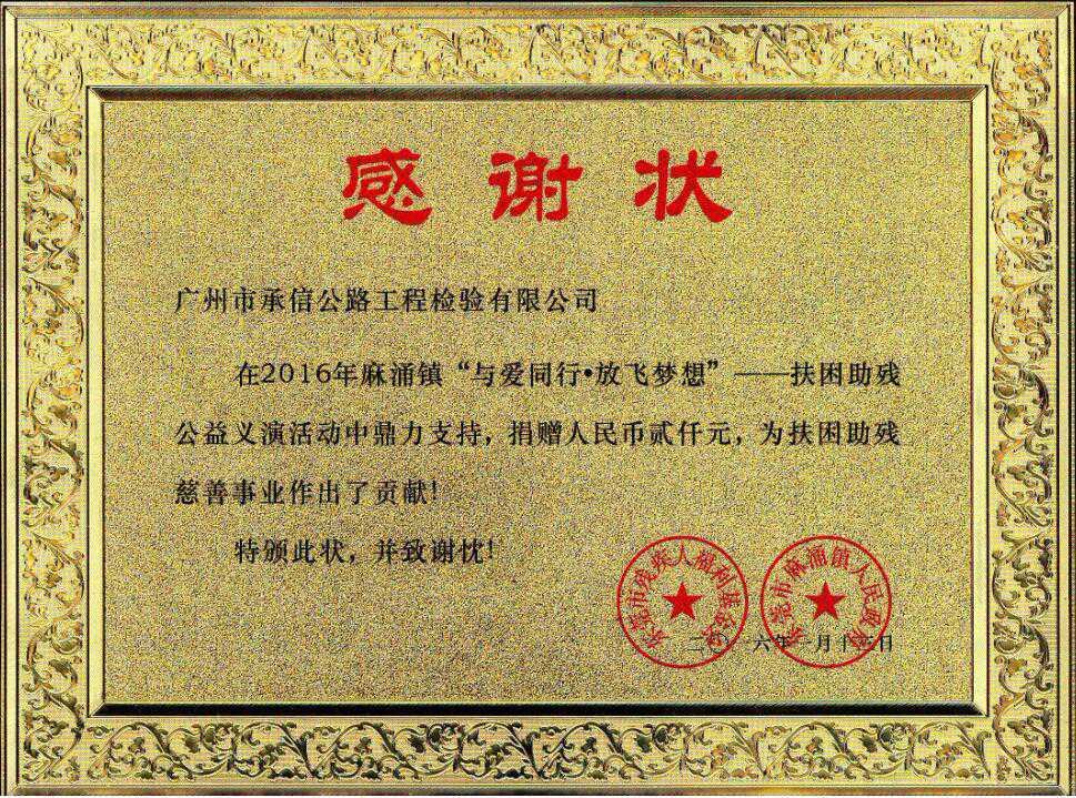我司榮獲2016年?yáng)|莞市麻涌鎮(zhèn)扶困助殘感謝狀
